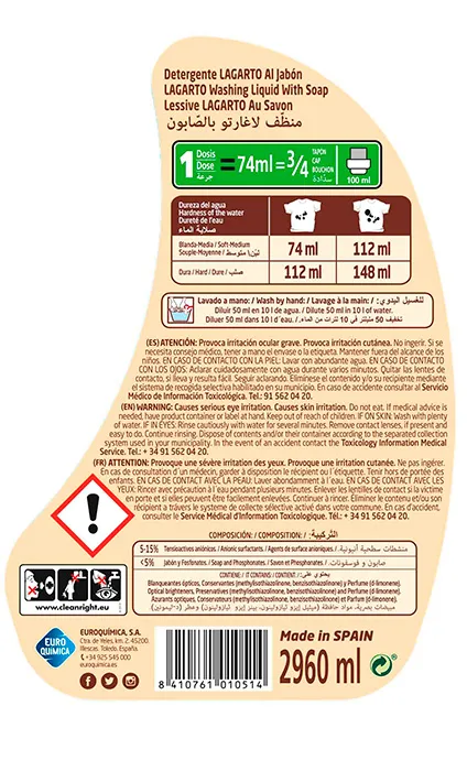 Detergente líquido para el lavado de ropa con autentico Jabón Lagarto.